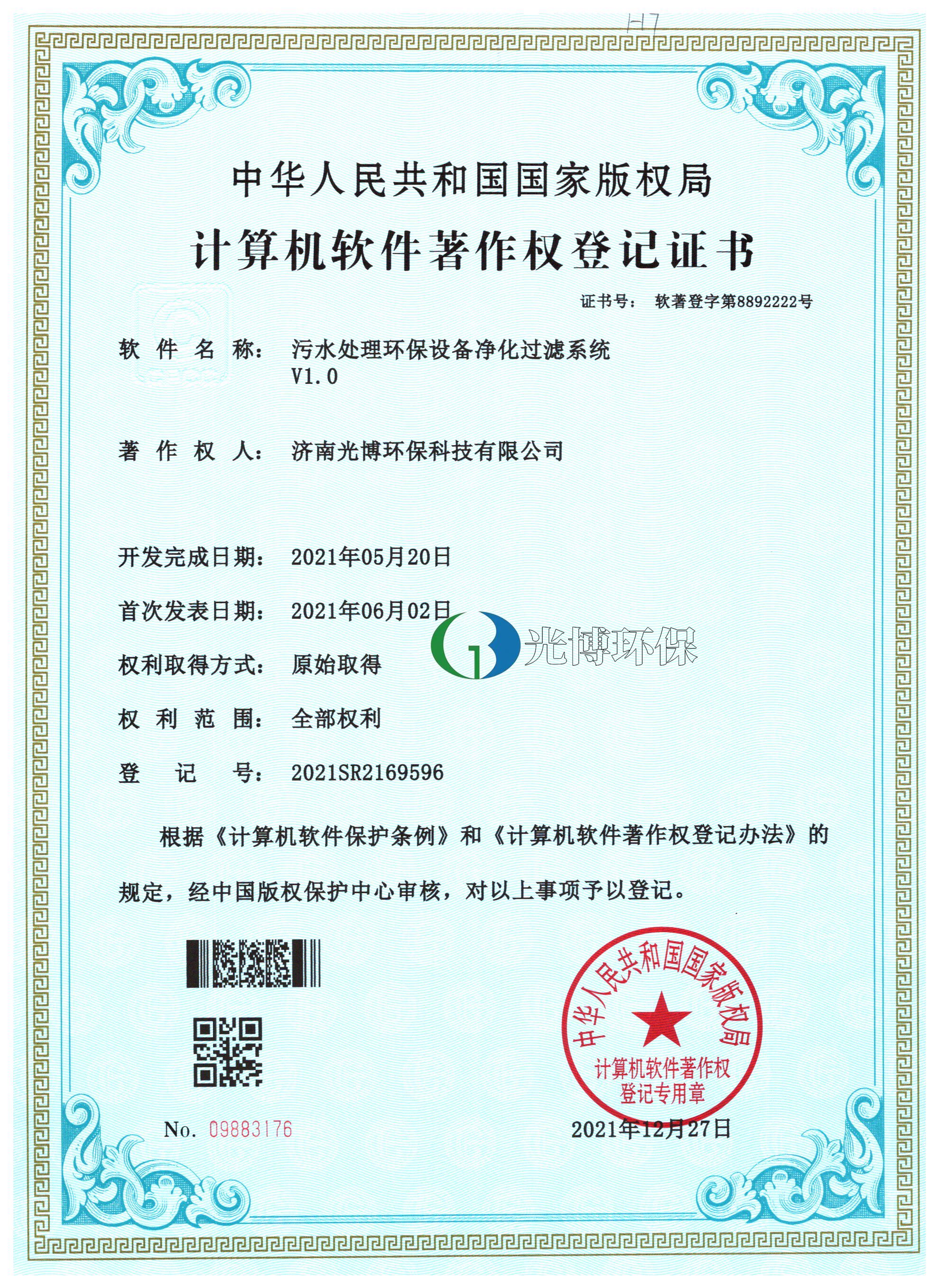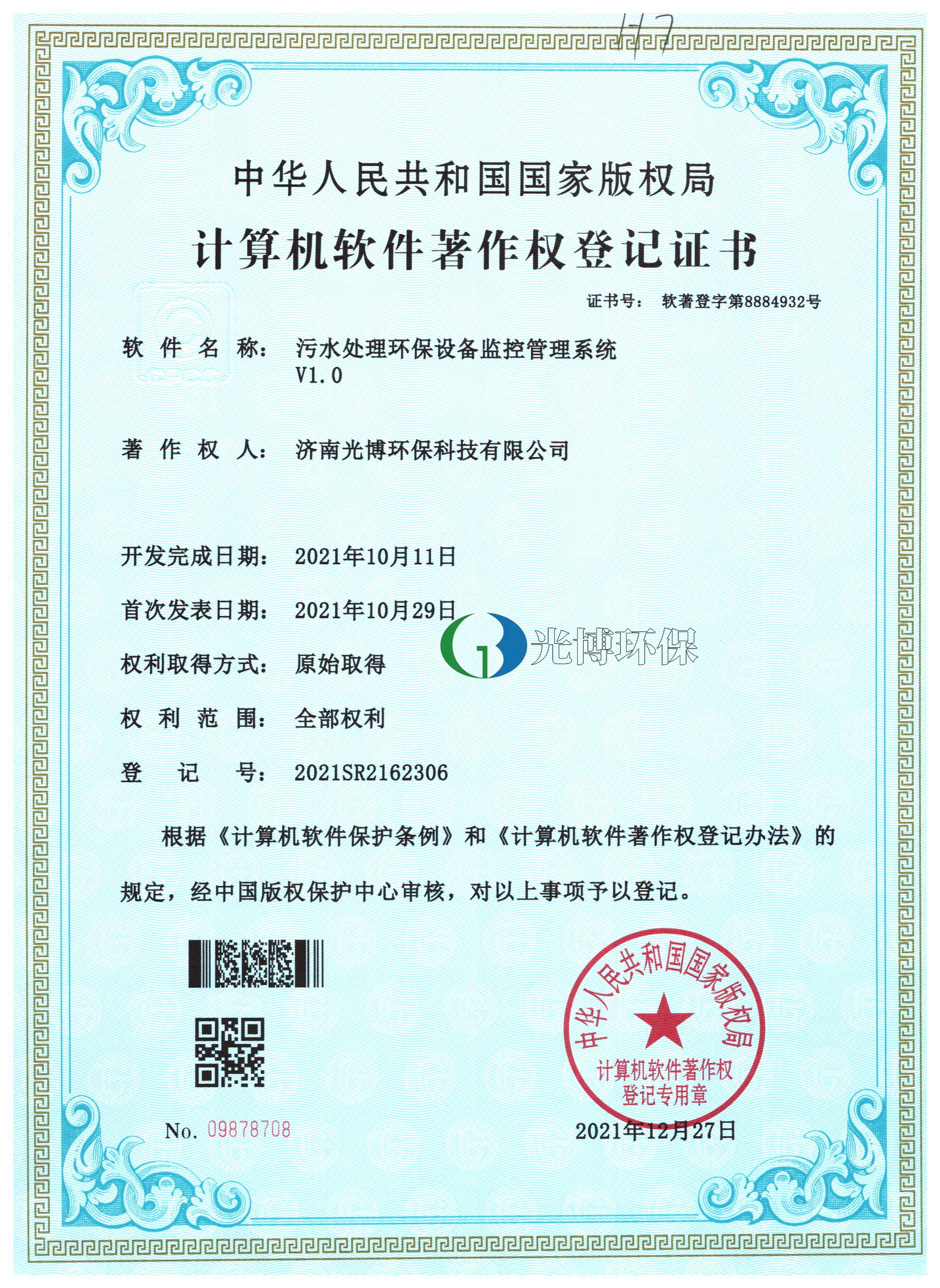 计算机软件著作权登记证书-污水处理环保设备智能化监测处理系统