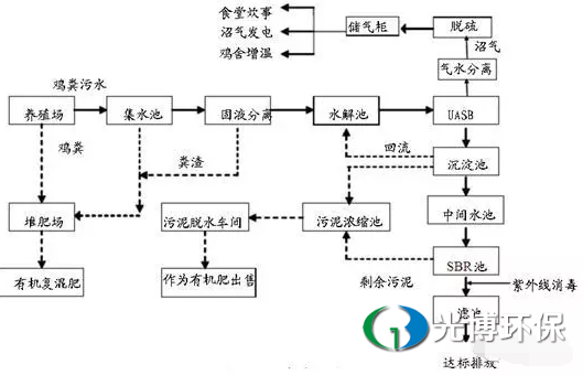 根据以上养鸡污水的特点,出现“固液分离+厌氧+SBR”工艺,工艺流程图如下: