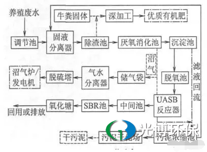 从目前国内外对高浓度污水处理的研究成果和实际工程运行效果来看,厌氧污泥法对COD的去除率远高于好氧活性污泥法,这主要是因为好氧生物在分解消耗污水中的有机物时,需消耗大量的氧气。如进水有机物含量过高,污泥无法承受高负荷有机物冲击。水中溶解氧急剧下降,导致活性污泥失效,无法达到预期处理效果。正对养殖污水的特点,我们采用厌氧消化—UASB—SBR—生物氧化塘组合工艺处理养牛污水,工艺流程图如下图所示: