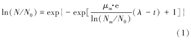 式中,N为某生长时间t下细菌悬浊液在600 nm波长下的吸光度值(cm-1);N0为细菌悬浊液在600 nm波长下的初始吸光度值(低于检测限,则初始值定为0.001)(cm-1);Nm为细菌的最大生长量,即细菌悬浊液在600 nm波长下的最大吸光度值(cm-1);μm为细菌的最大比生长速率(h-1);λ为迟滞时间(h);t为生长时间(h).